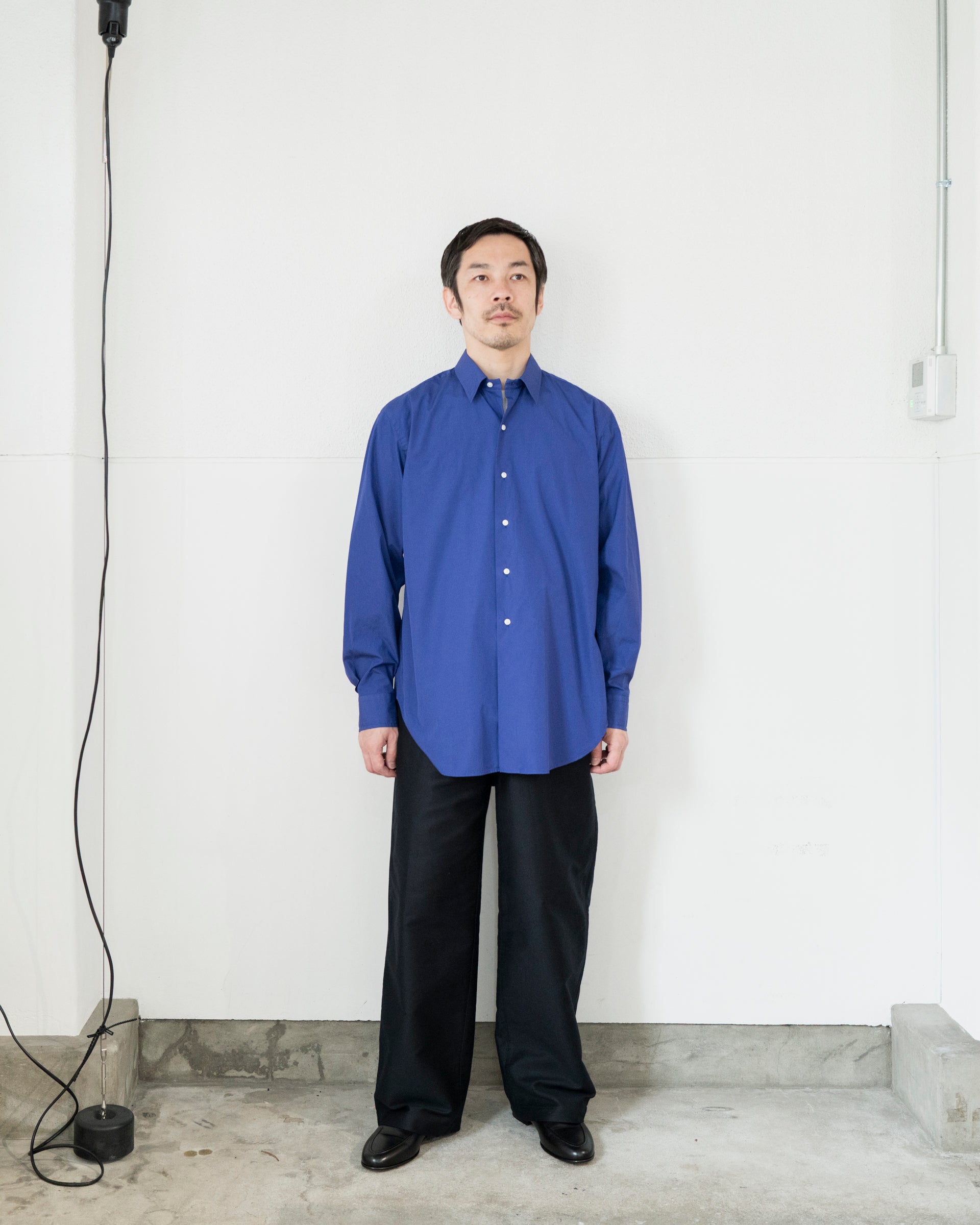 見え面はかなり違うが、定番のJamesジェームズやRobロブのホワイトと同じ生地ということで小山氏が好んで使用するファブリックであるが、製品染めが施されているためタッチや風合いに変化が起きている。