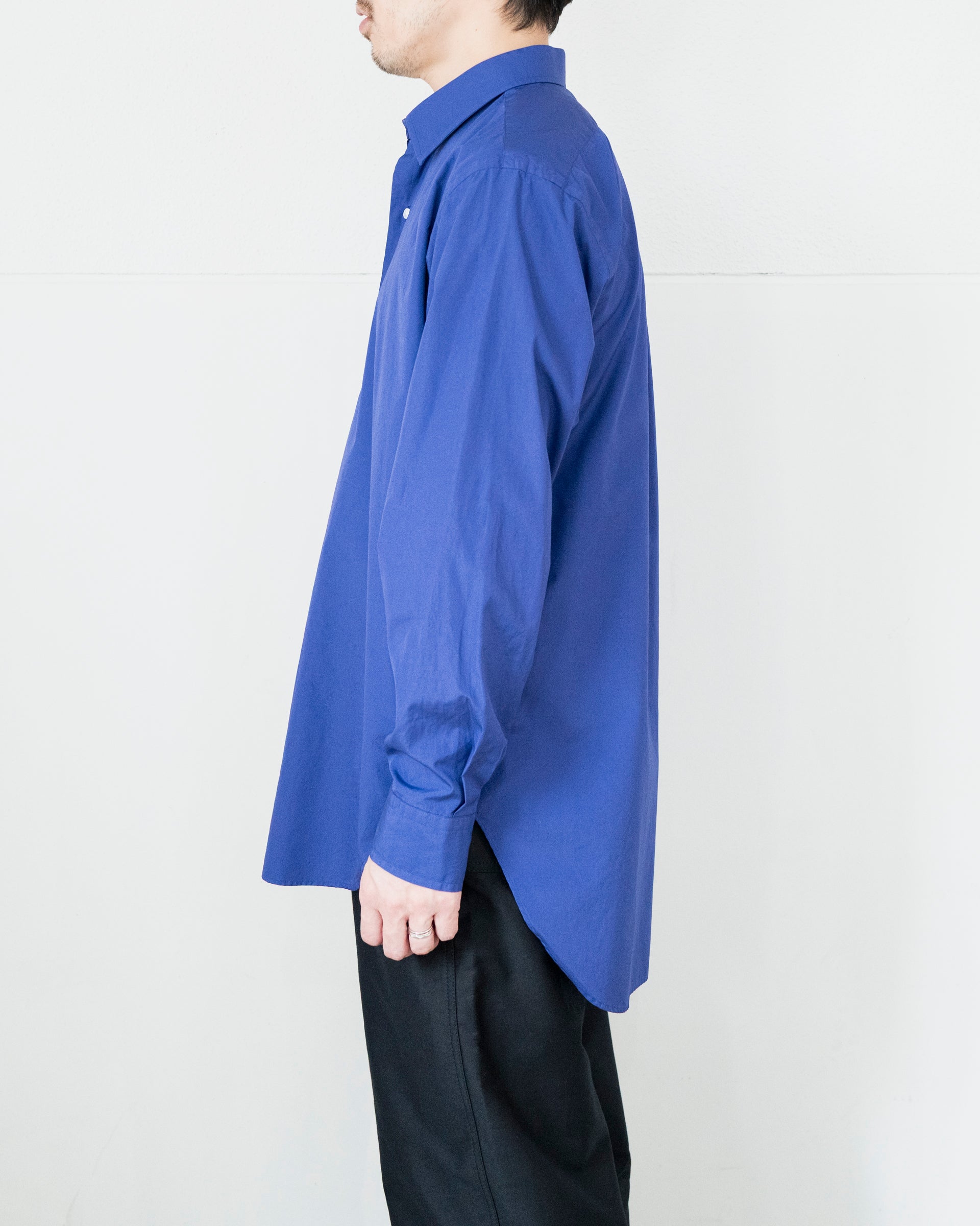 ユーゲンのシャツの中ではレングスは短めになるが、裾のラウンドカットを深く、テールを長く取る独特なバランスとボタン間隔を詰め、重心を上に誘導するデザインが印象的な一着である。