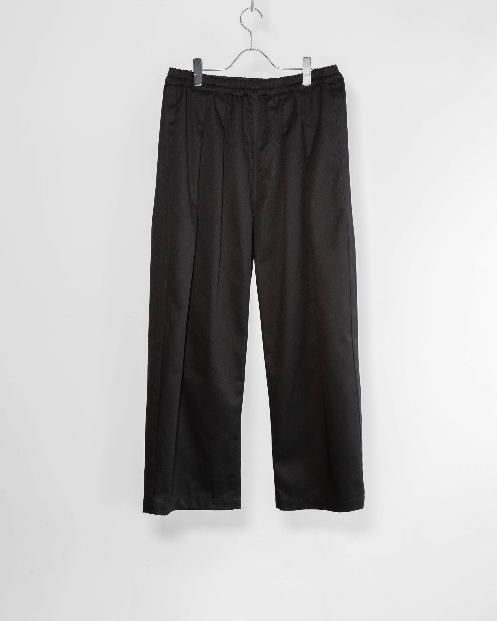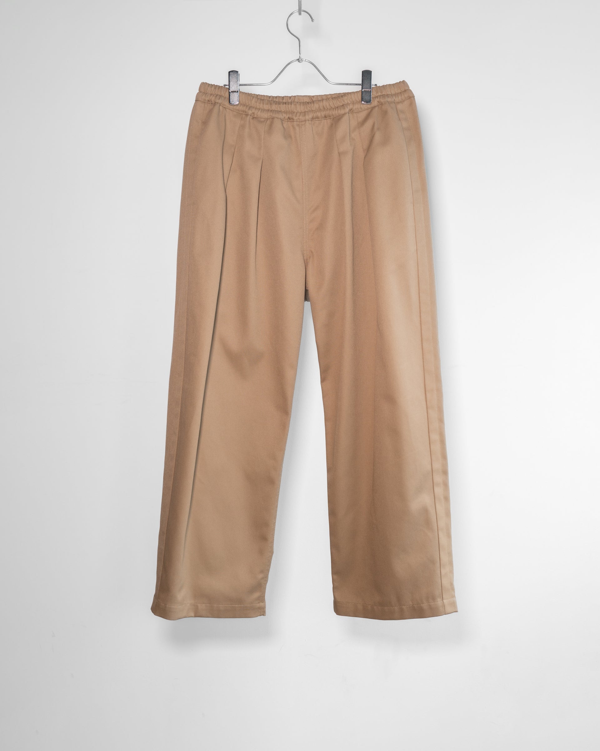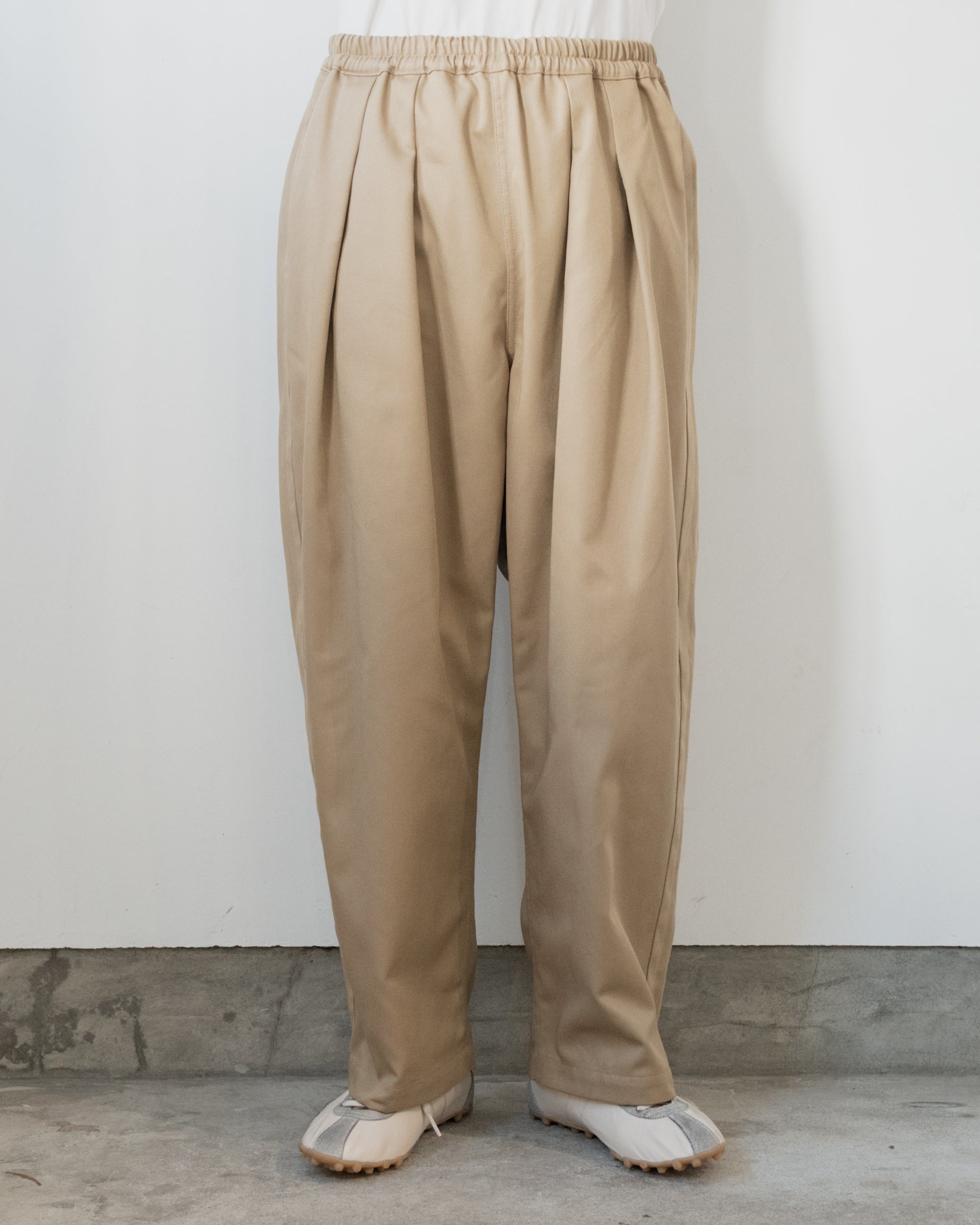 あえて大きめに作られたウエストを内側に備えられたドローコードでグッと絞り、2インプリーツのたっぷりとしたシルエットを楽しんでいただくモデルである。