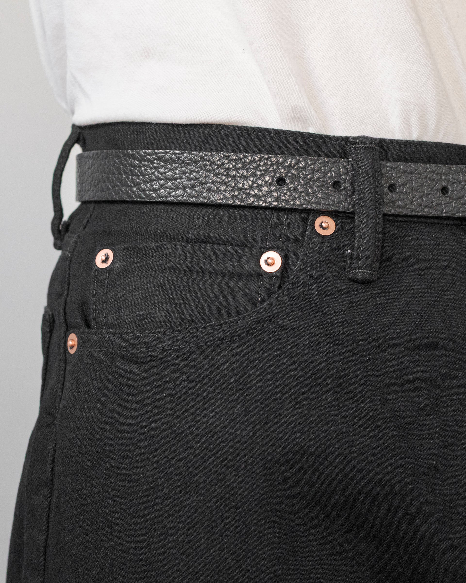 通常デニムは緯糸には白を用いるが、ブラックは経緯ともに硫化染のブラックを用い、マットな表現が重視されている。