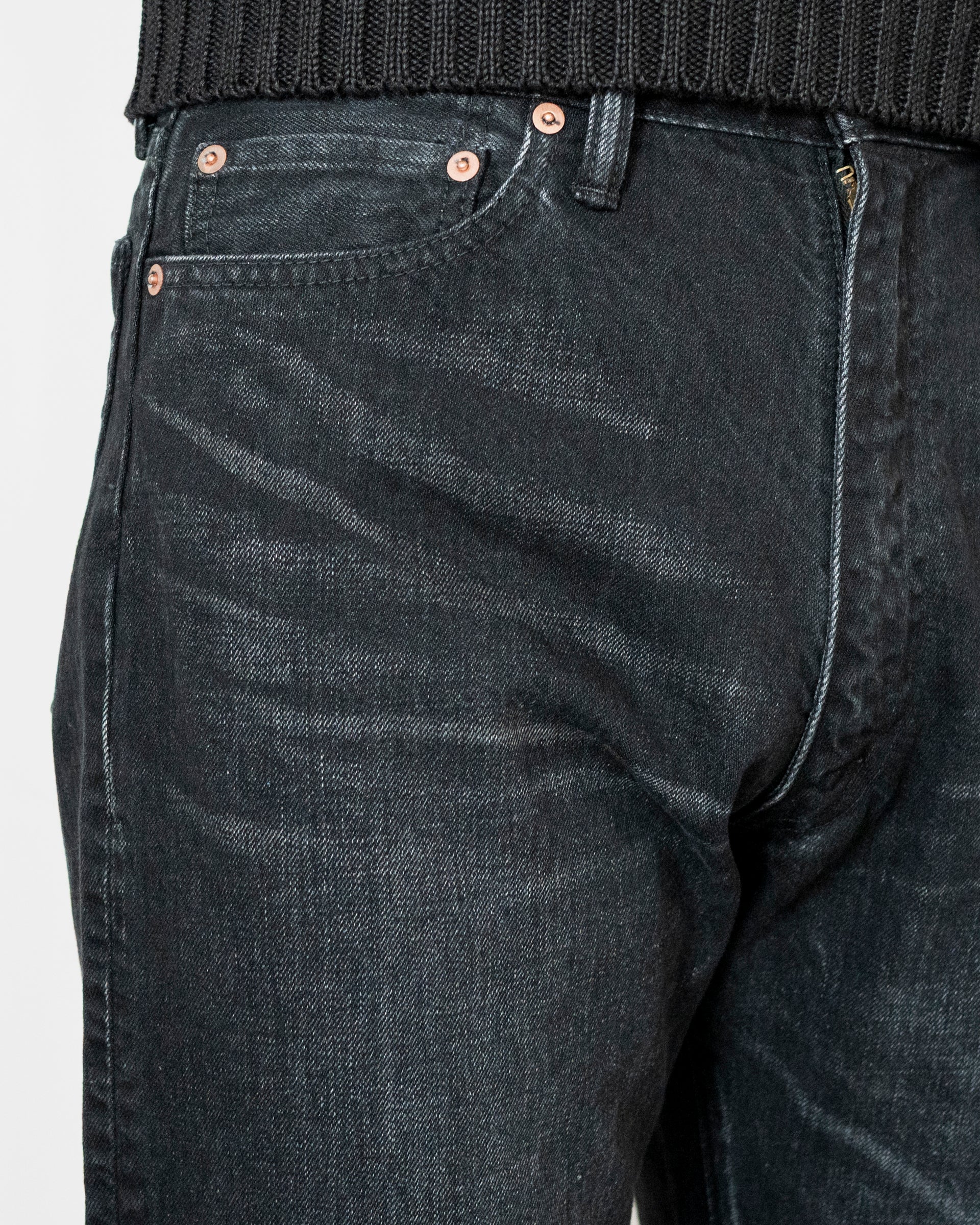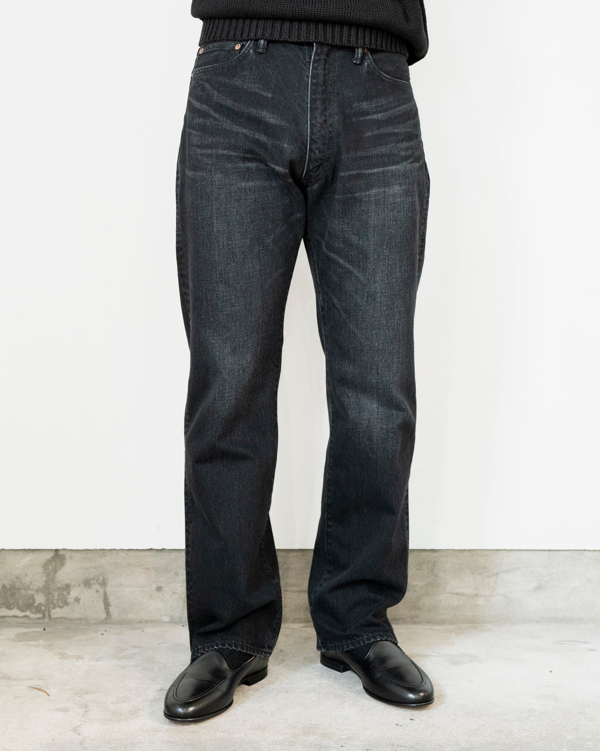 硫化染めはフェードしやすい特徴があるので、インディゴ染めのような経年変化も楽しむことができるところが魅力であり、長く穿き続けるのが楽しみな仕上がりだ。