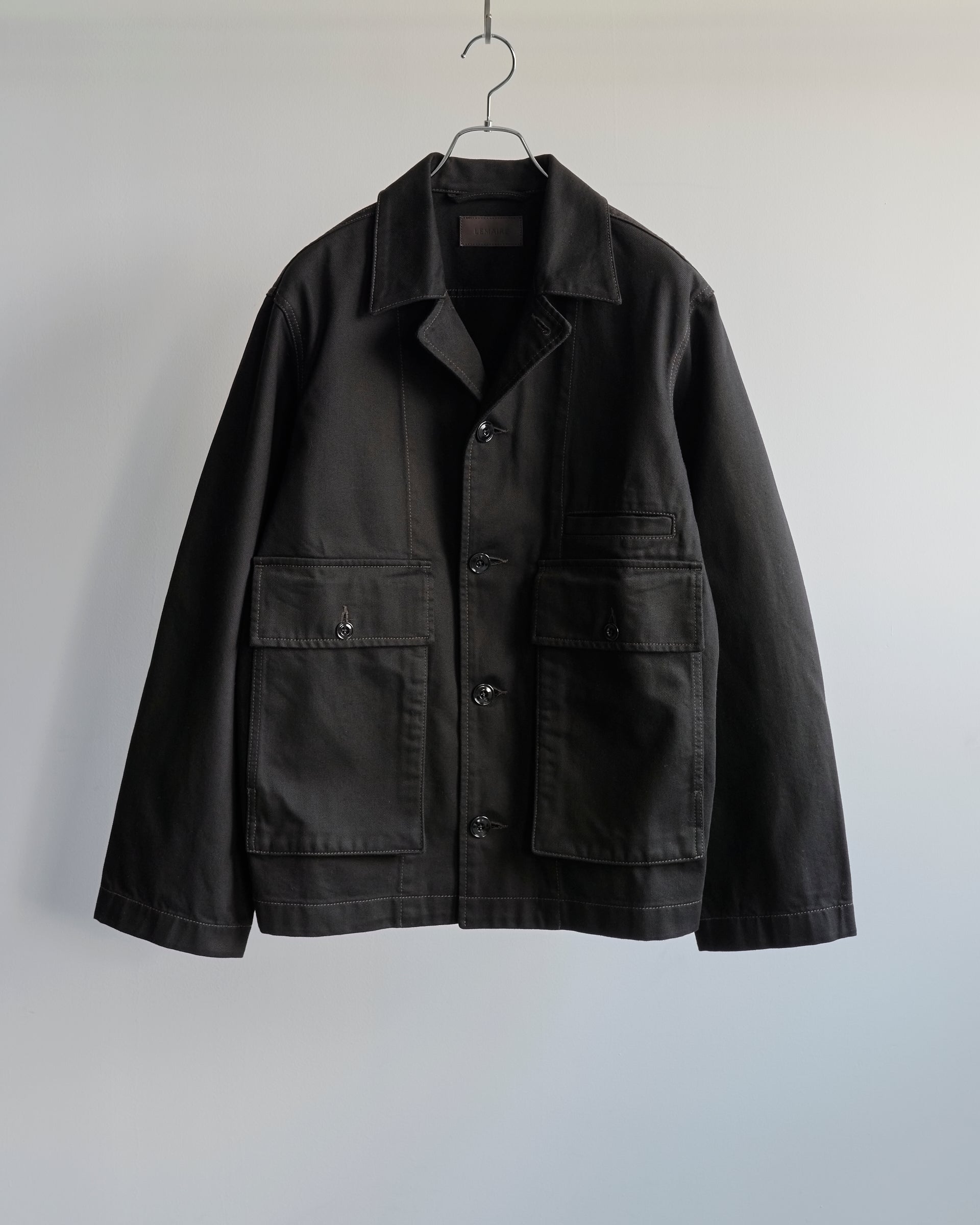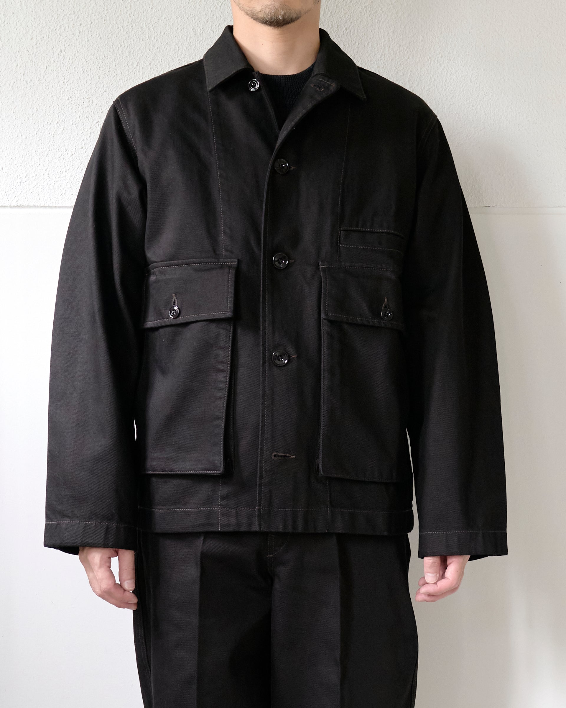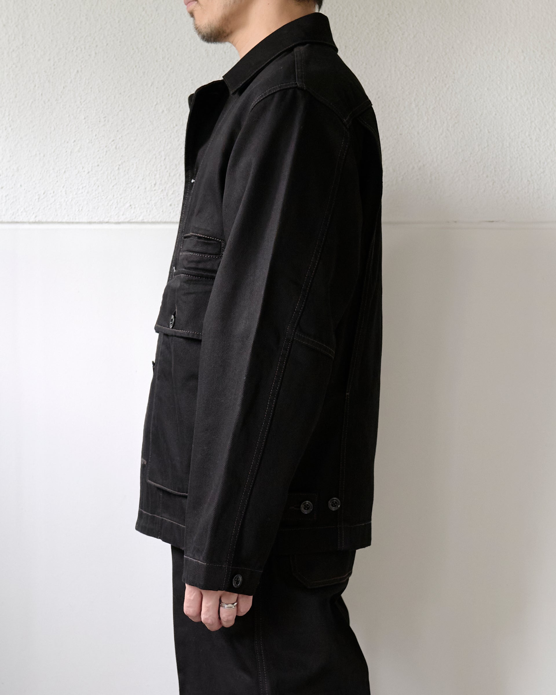 この生地はLD1055、ヘヴィーブラックデニムという生地が用いられており、同素材での提案はトラッカージャケットやデニム、ワークパンツなどになる。