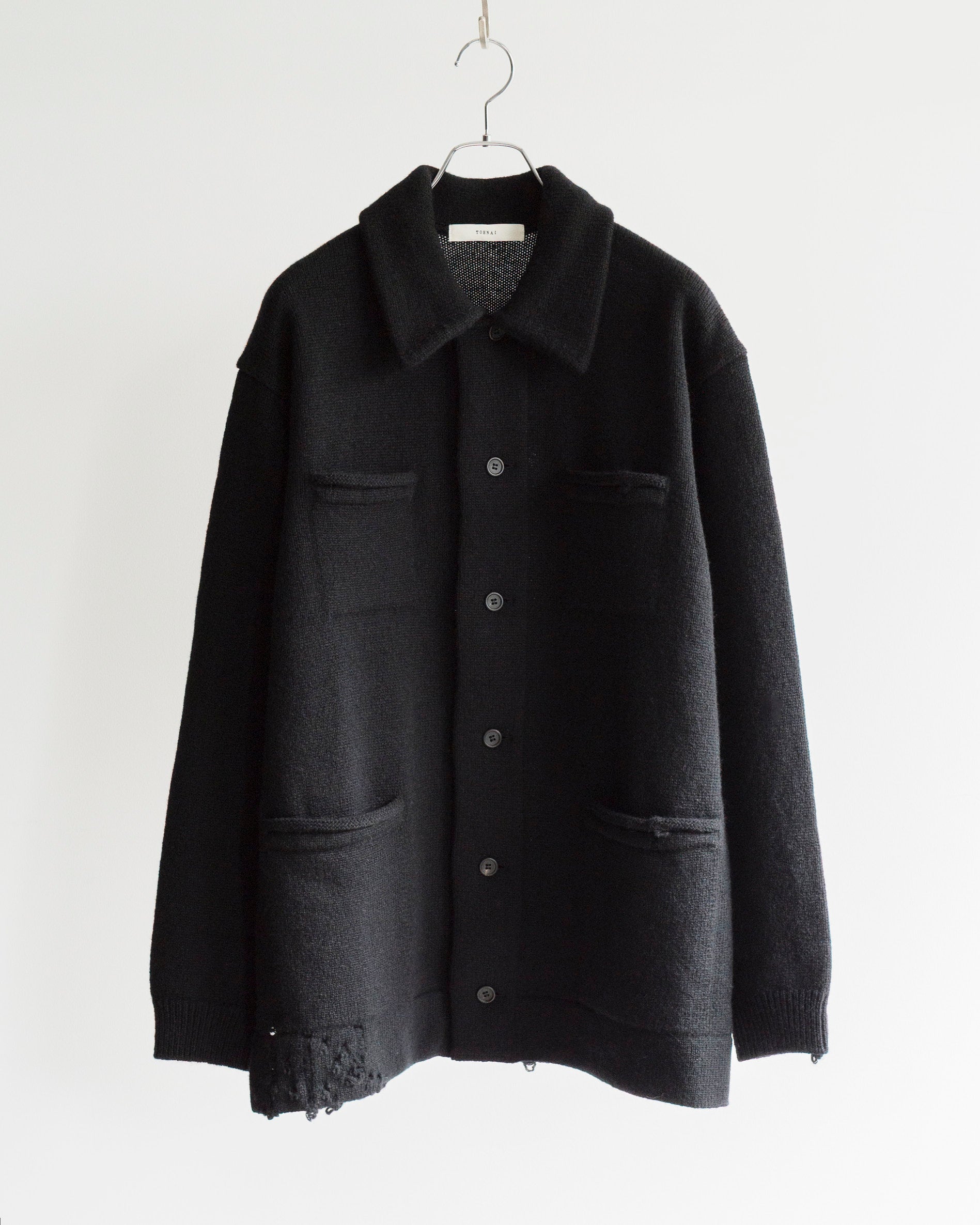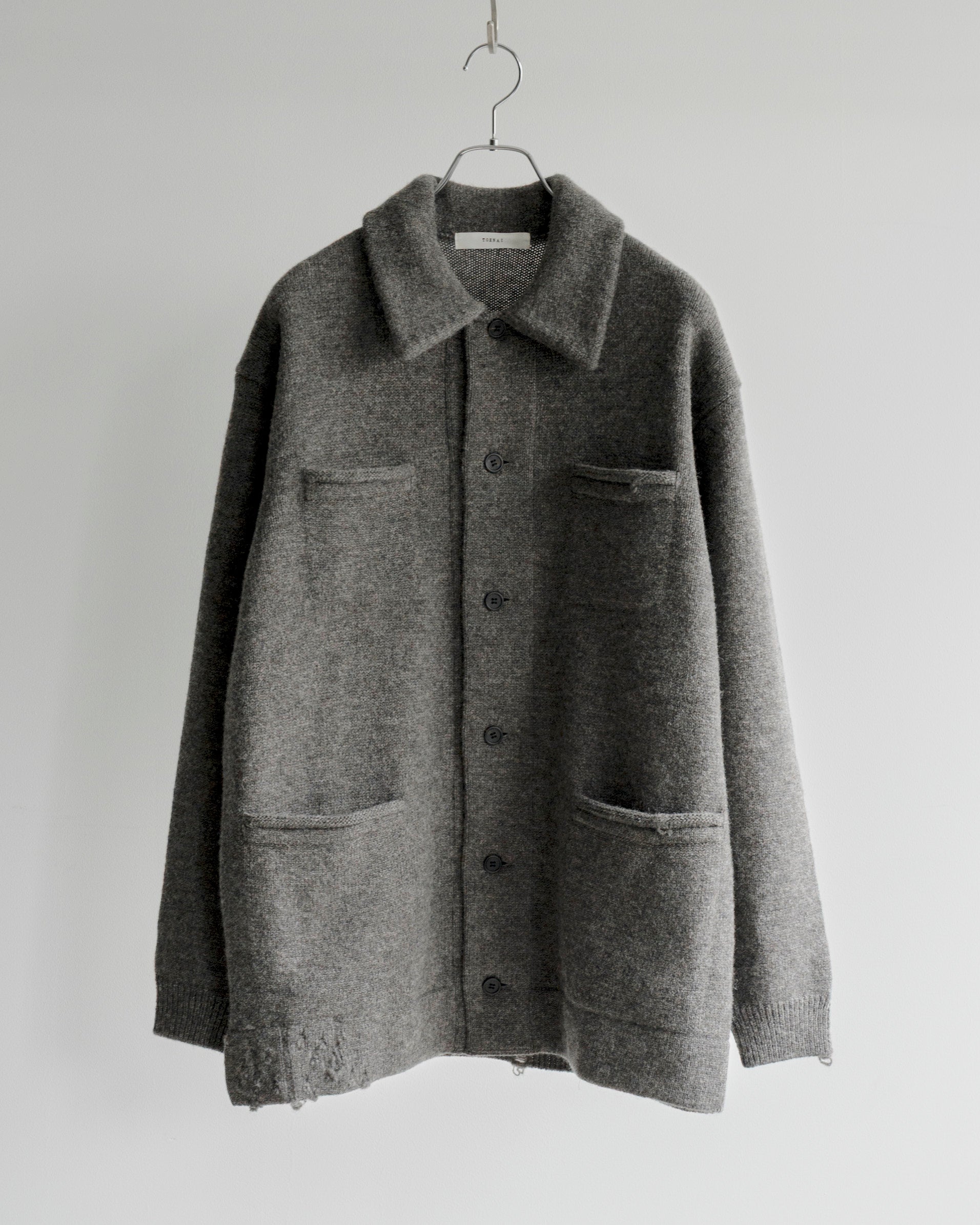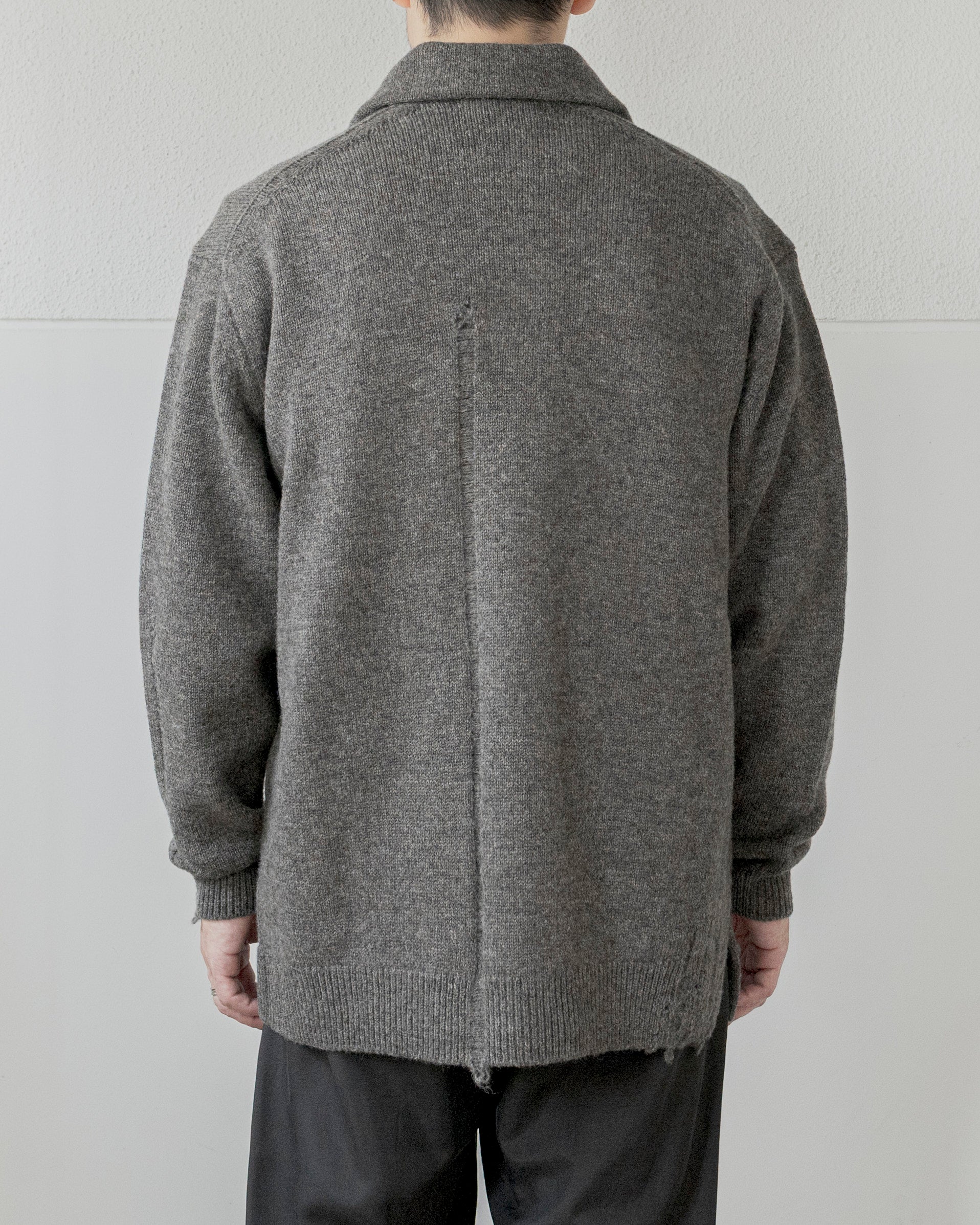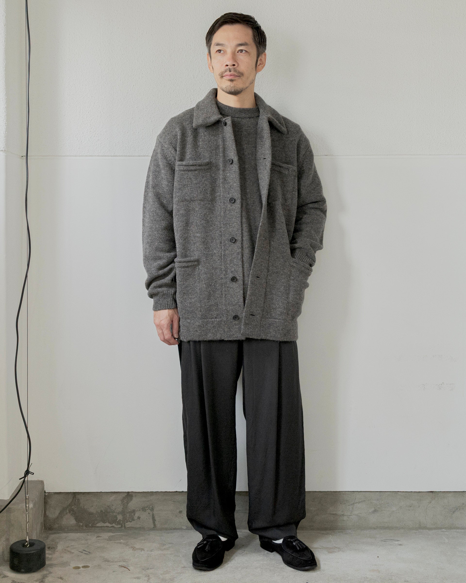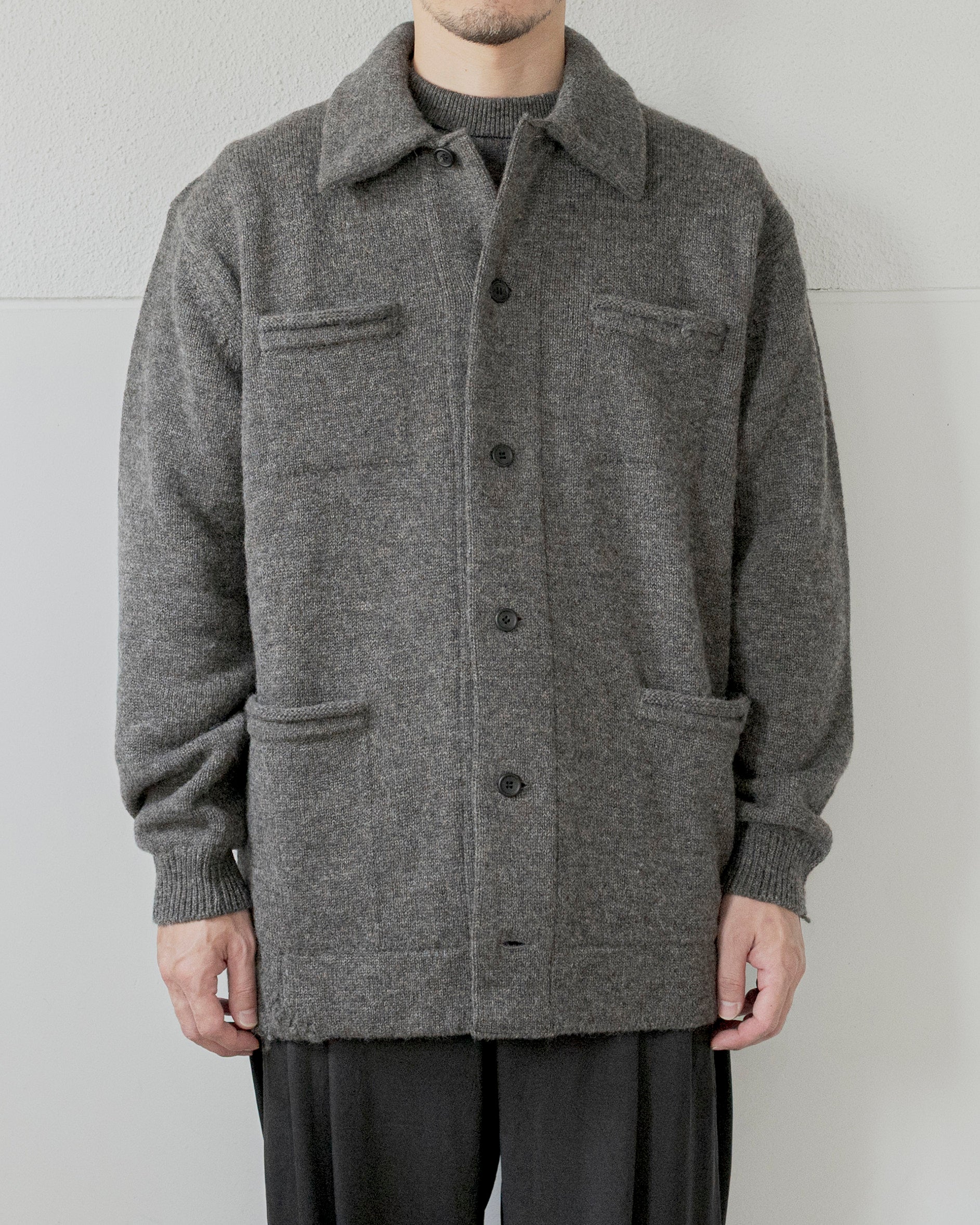 ニットであるがジャケットであり、ジャケットであるがアウターに近いイメージでも着られるユーティリティアイテム、ふっくらとした編み地は5ゲージであり、ボリュームのあるチャンキーウール糸で編み上げていることからしっかりとした肉感があるところが特徴である。