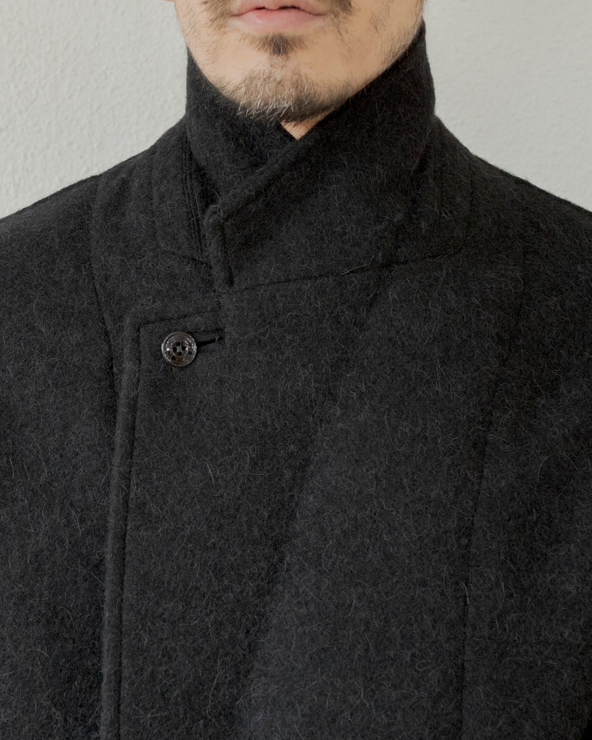ウール×アルパカの上品で繊細な生地ではあるが、フェルト化されているので起毛感があり、アウターライクに見えるところもワーク調に感じさせる要因か。