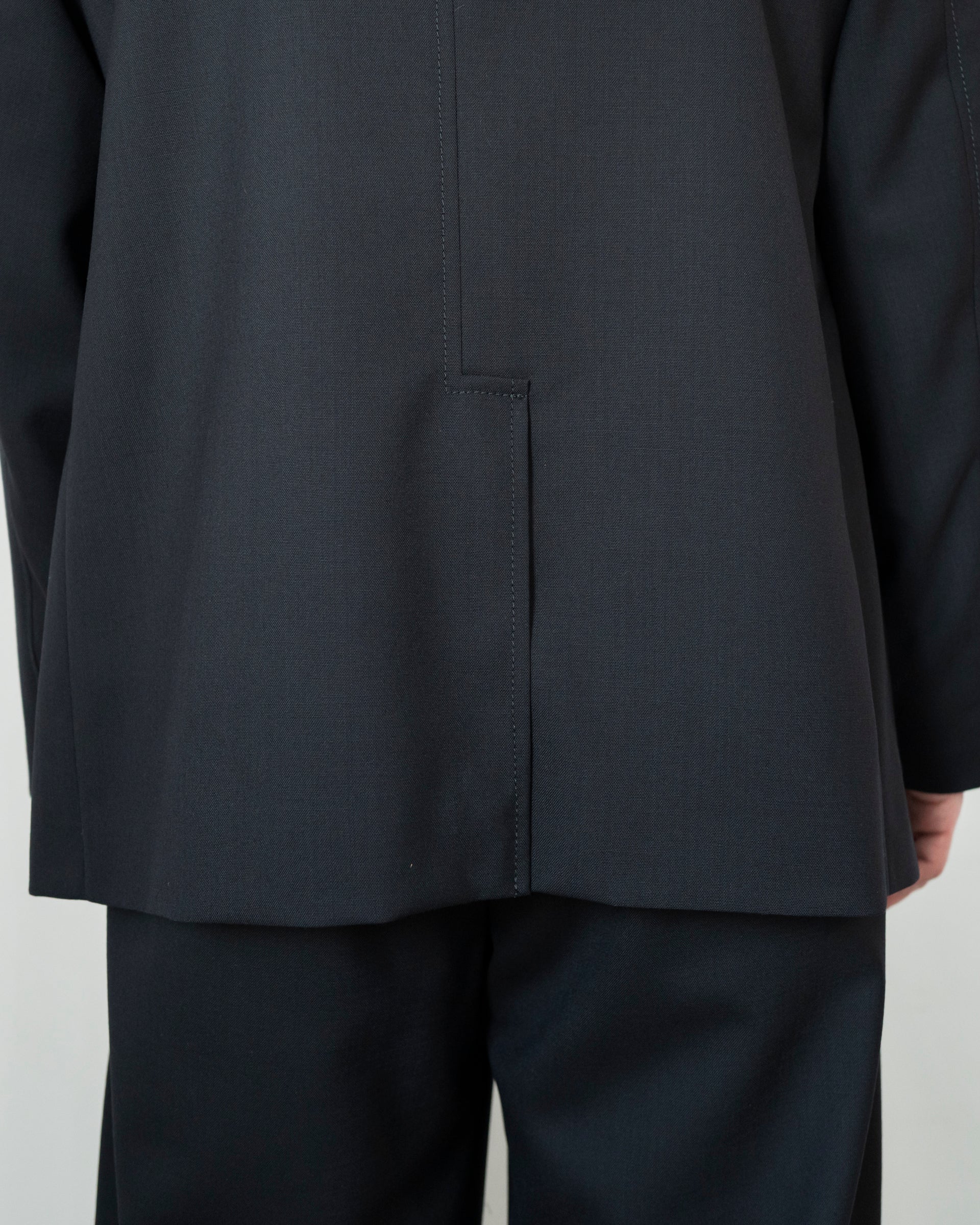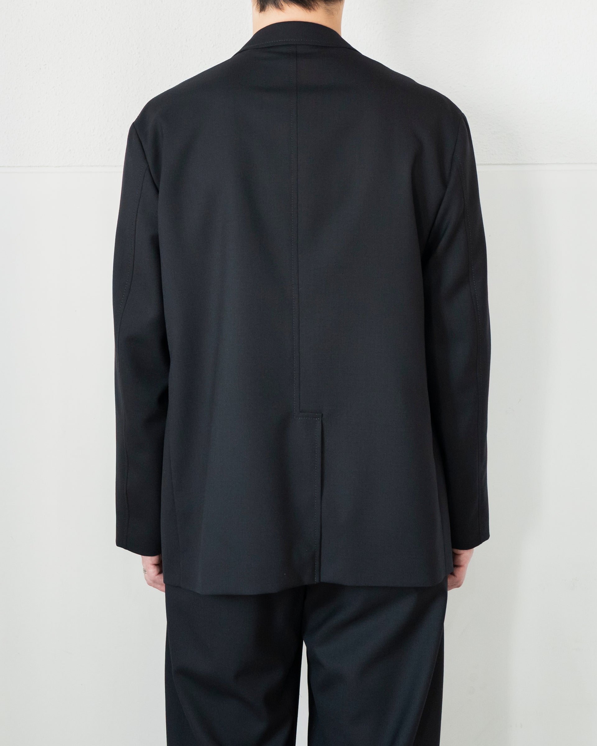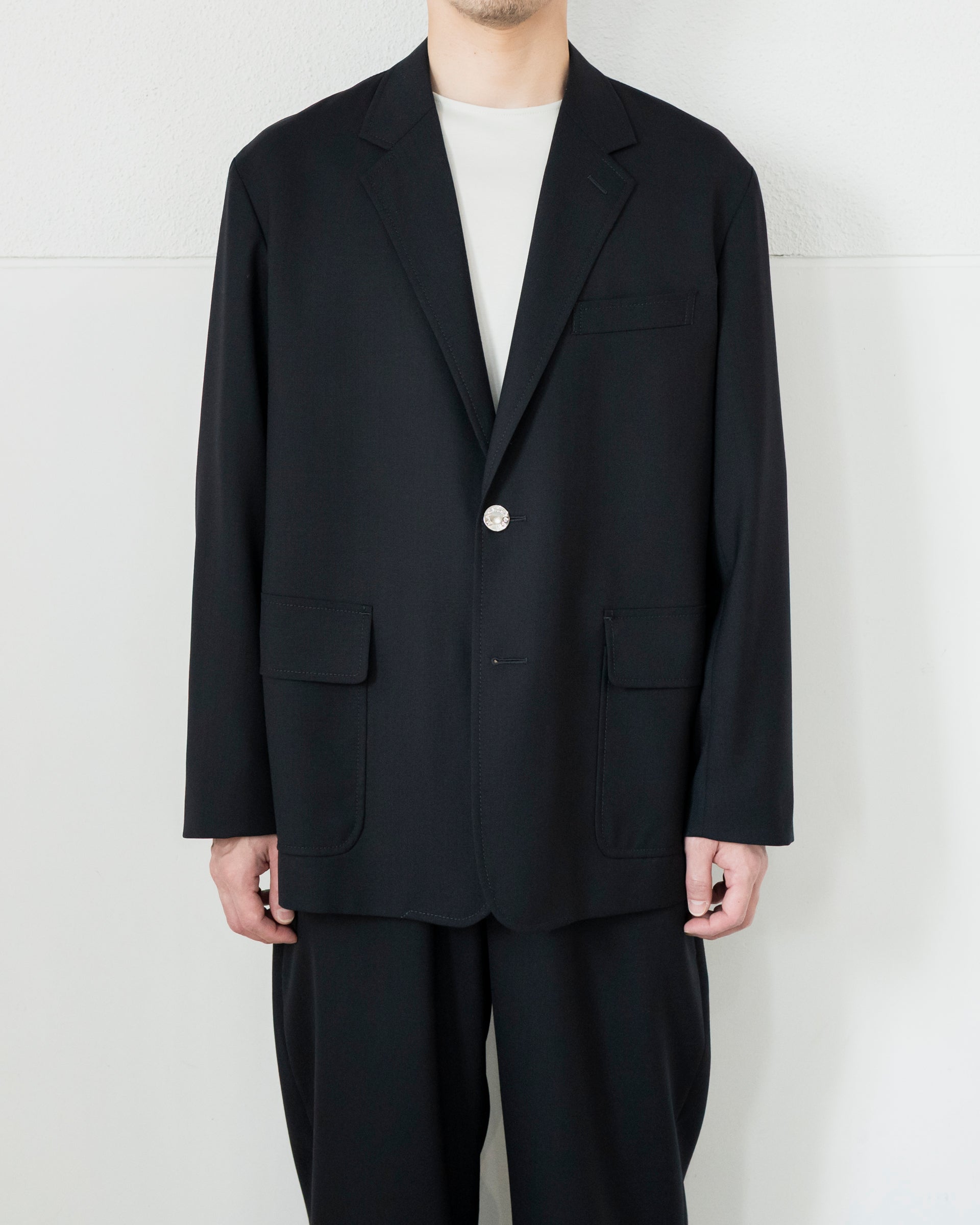 フロントはブランドの刻印が入ったシルバーメタルの2ボタン、胸はウェルトポケット、腰はパッチ&フラップポケット、ベントはセンターのフックベントとブレザースタイルを踏襲。