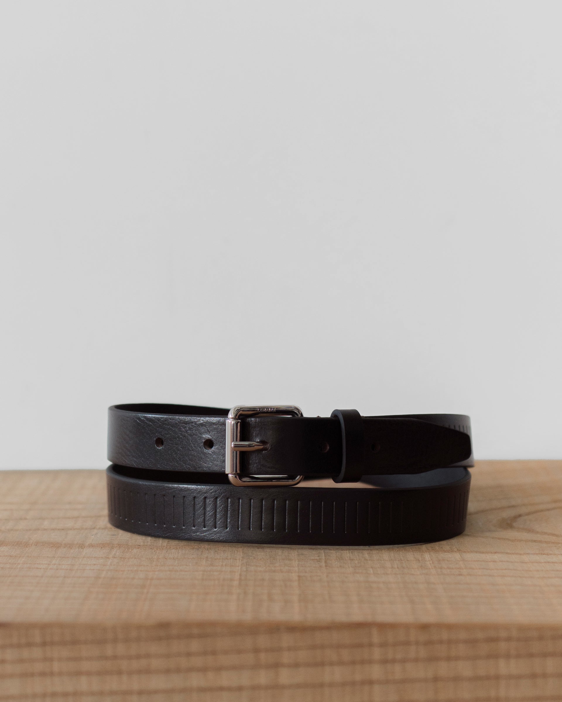 レールのモチーフを型押ししたシンプルなベルトであり、極めてシンプルな見え方であることから様々なスタイルに合わせることが可能な仕上がりになっている。