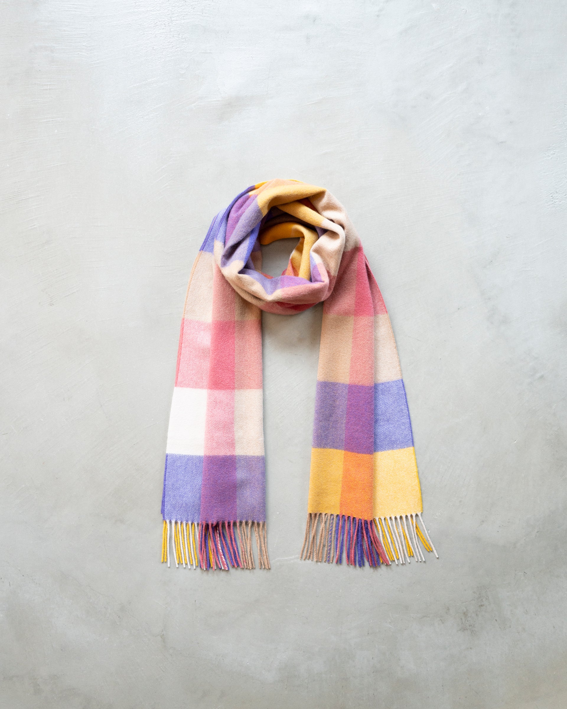 使用されている最高級のカシミア原毛はもちろん、多くの人々を魅了してるのは英国伝統のパターンを再構築し、独自のバランスにアレンジされた多彩なチェック、そしてあまりにも美しすぎる配色の妙である。