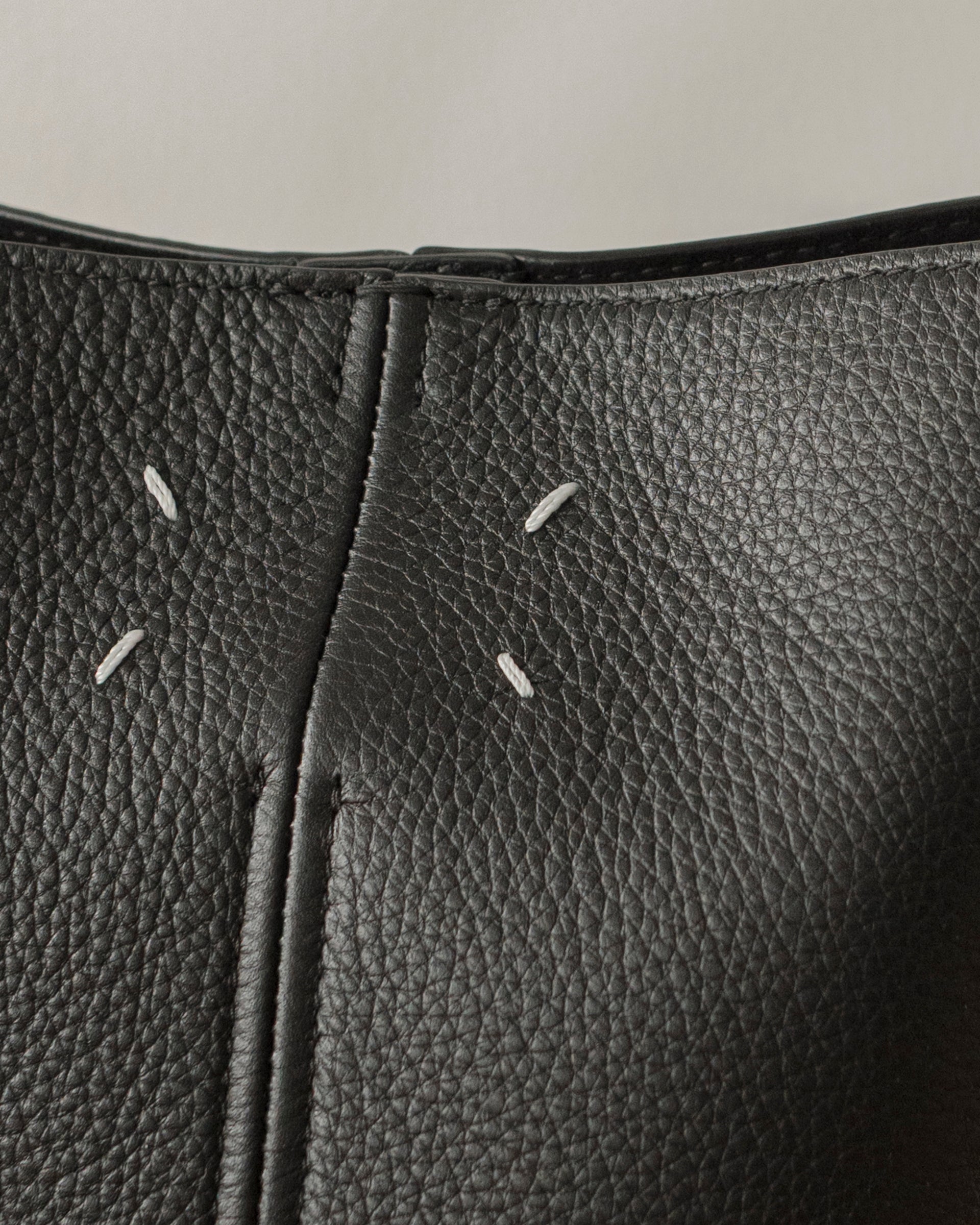 逆台形フォルムでマチ幅を広めにとり、開口部のマグネットを留めることによりソフトなレザーがたわみ、奥行きと陰影を産む。女性的な柔らかさと優雅さがあり、男性的な力強さがストラップによって表現されている。