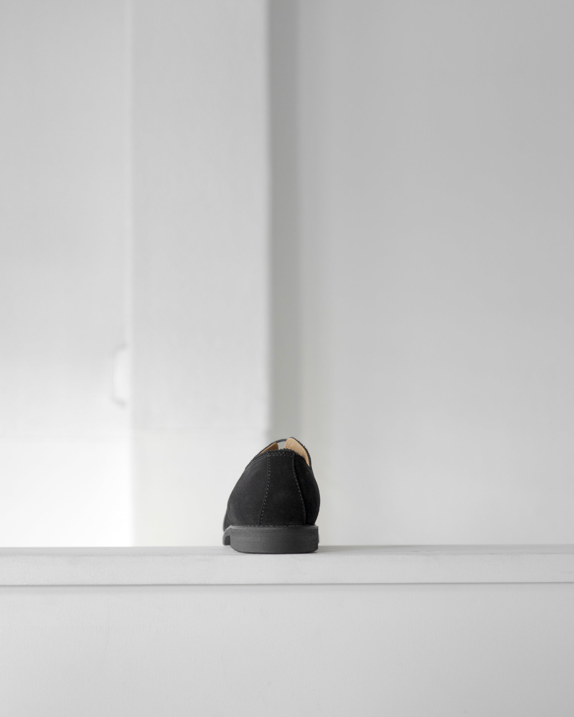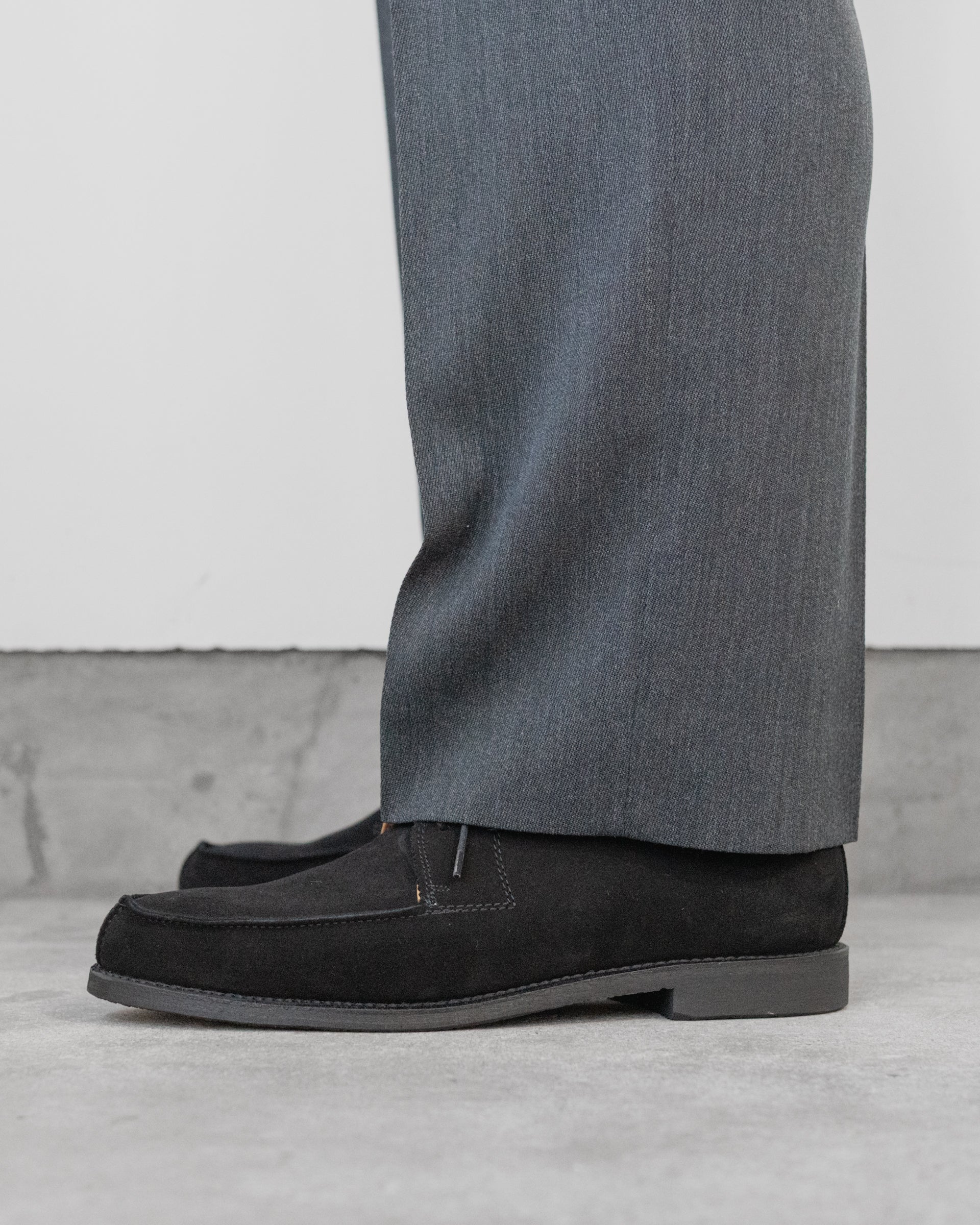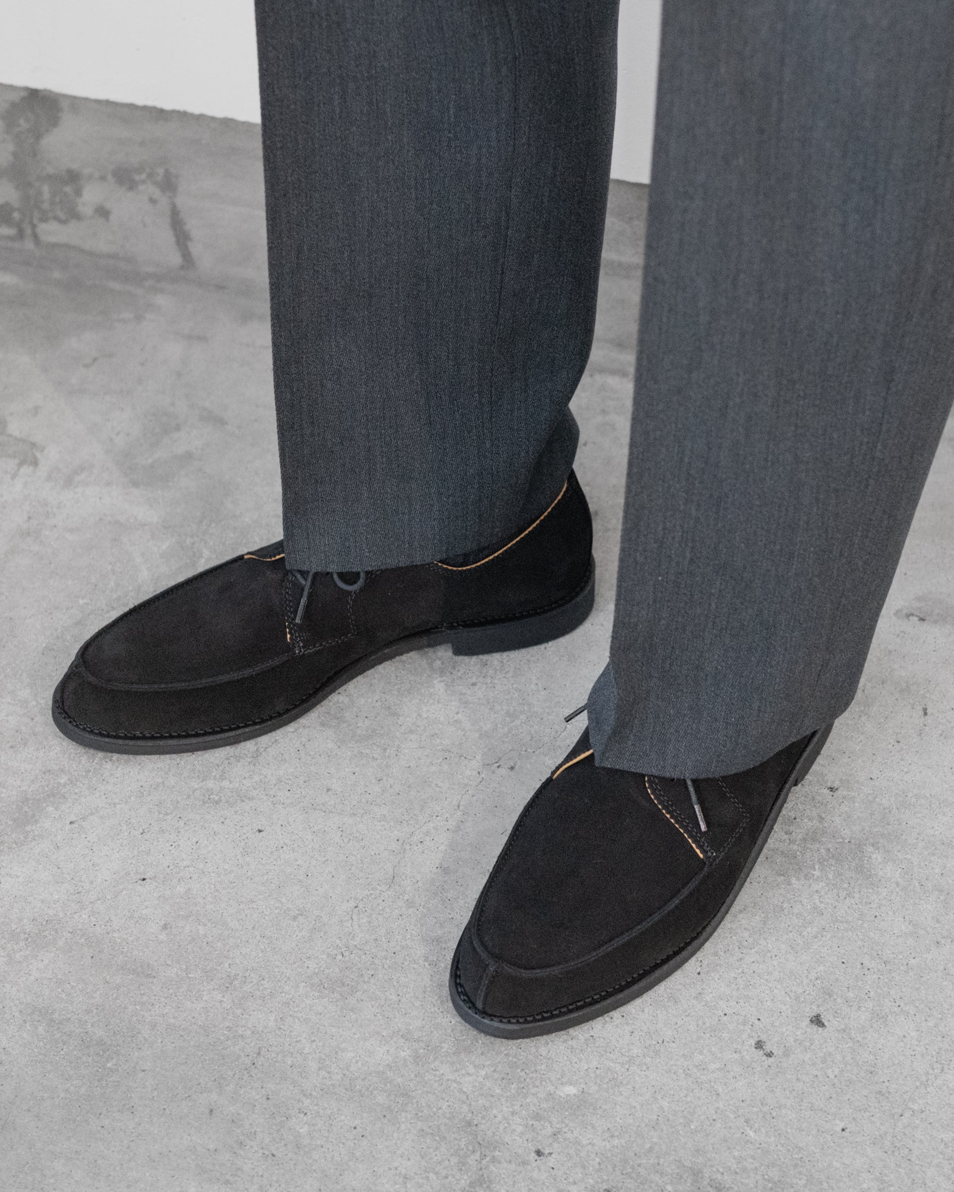 使用するレザーによってかなり雰囲気が変わるデザインではあるが、上質なカーフスエードを用いることで洗練された印象になり、ライニングのナチュラルカラーのレザーがとても良いコントラストを生んでいる。